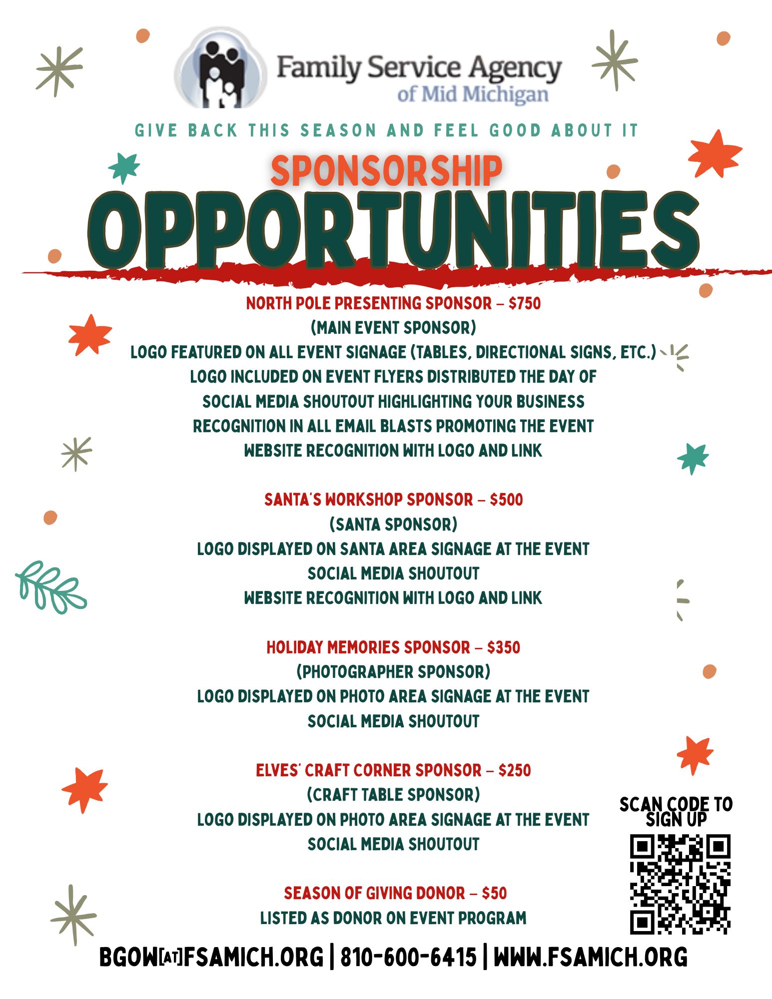 We are offering several sponsorship levels — from our North Pole Presenting Sponsor ($750) and Santa’s Workshop Sponsor ($500) to our Holiday Memories Sponsor ($350), Elves’ Craft Corner Sponsor ($250), and Season of Giving Donor ($50).