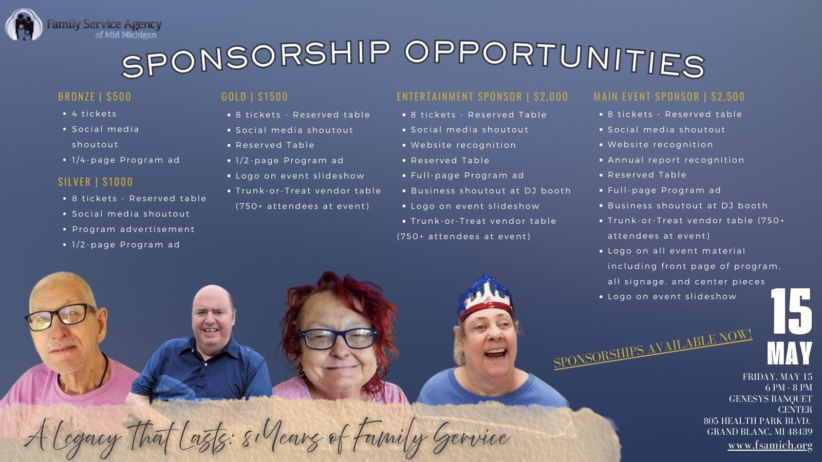 Be a part of A Legacy That Lasts: 81 Years of Family Service by becoming a Gala Sponsor. Your partnership helps ensure Family Service Agency of Mid Michigan can continue providing vital programs and support to individuals and families throughout Genesee County.